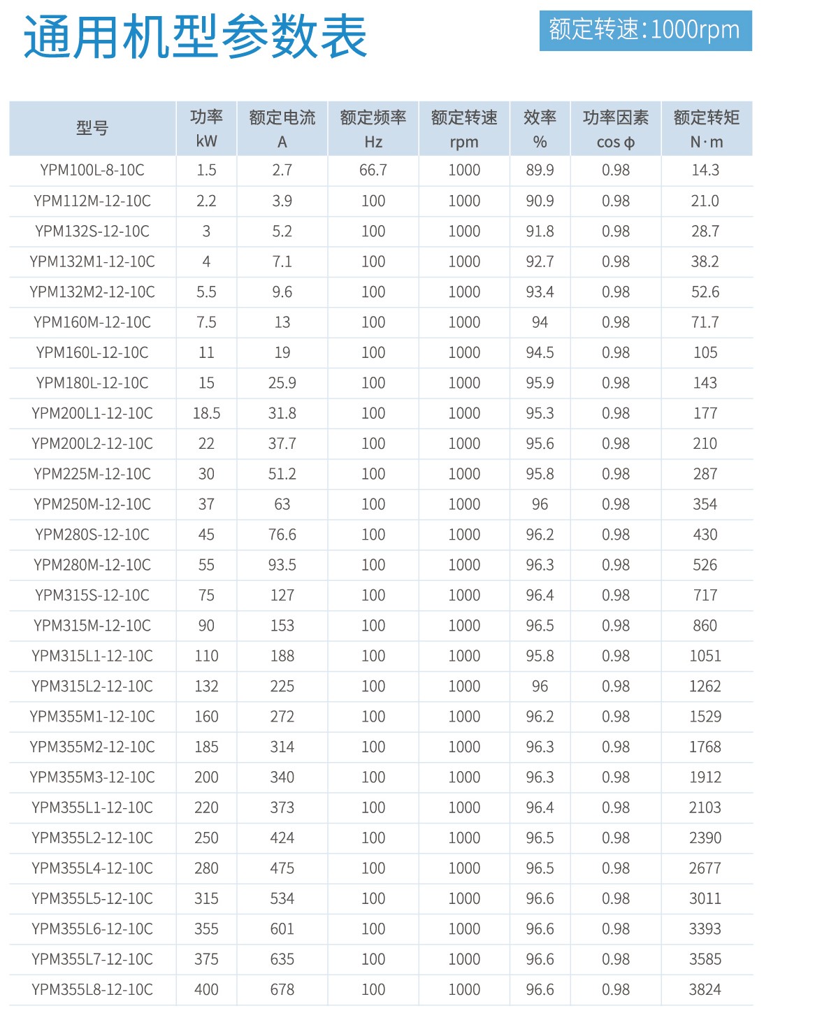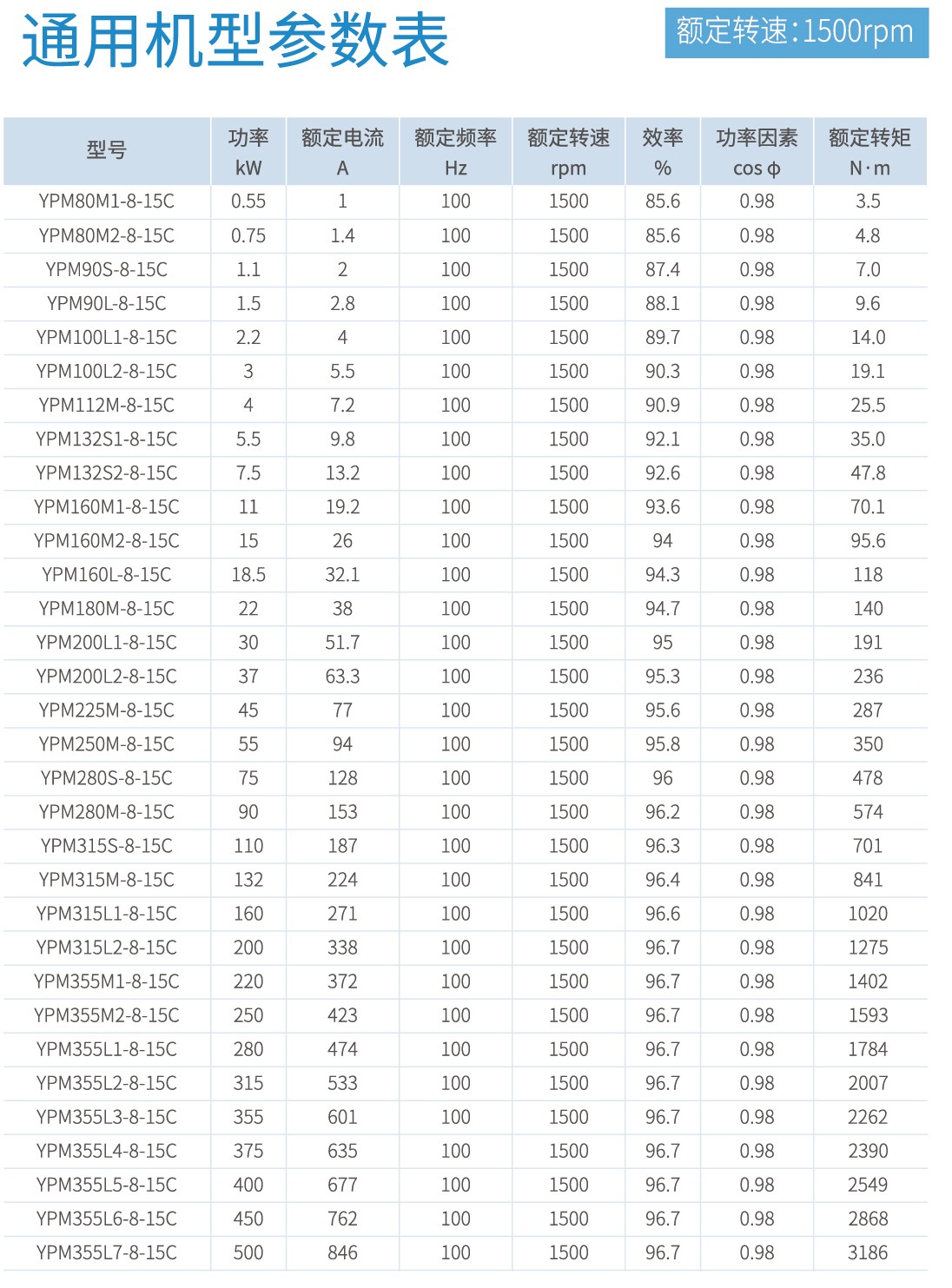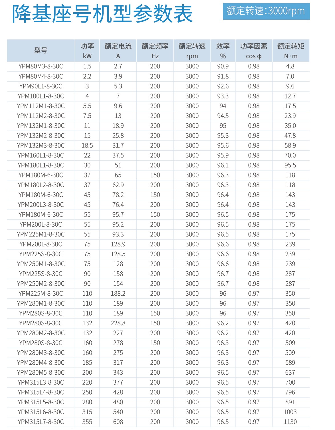 首页 产品中心 YPM系列永磁同步电机 YPM系列永磁同步电机 功率范围:0.55kW-500kW,0.55kW-90kW满足永磁同步电机能效标准GB 30253-2013规定的一级能效。 产品概述 规格参数 型号命名规则 使用条件及安装方式 外形及安装尺寸 轴伸尺寸 通用机型 降基座号机型 0.55kW-90kW满足永磁同步电机能效标准GB 30253-2013规定的一级能效。电机高效区面积更大,同功率对比传统感应电机,节能效果显著。磁钢内嵌式转子,高牌号磁钢,涡流损耗更小,温升更低。采用Y2/YE3外壳基座,便于替代传统感应电机。