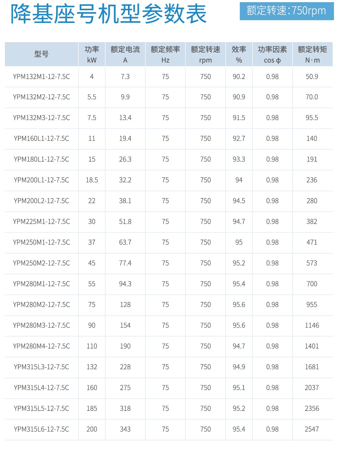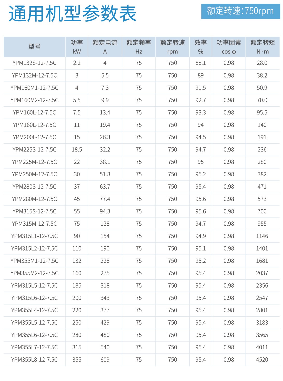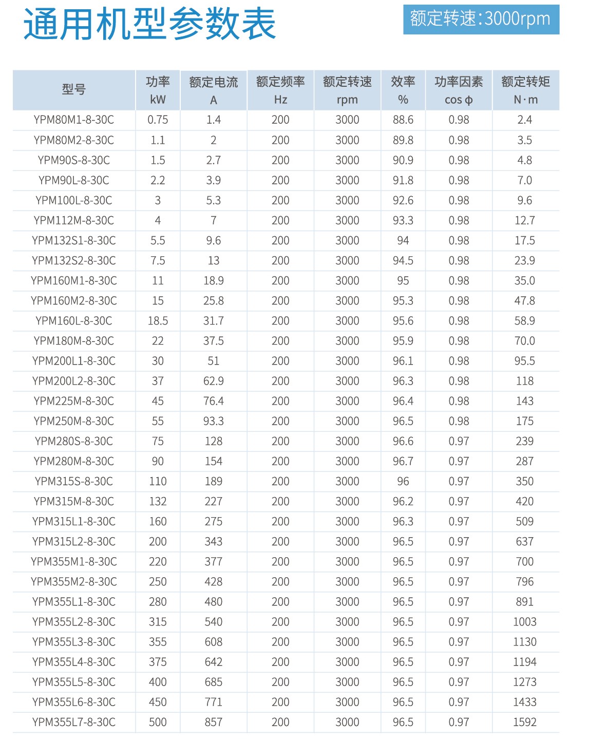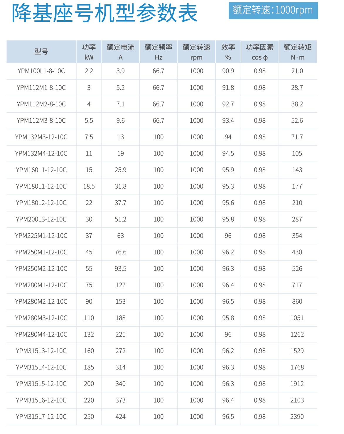 首页 产品中心 YPM系列永磁同步电机 YPM系列永磁同步电机 功率范围:0.55kW-500kW,0.55kW-90kW满足永磁同步电机能效标准GB 30253-2013规定的一级能效。 产品概述 规格参数 型号命名规则 使用条件及安装方式 外形及安装尺寸 轴伸尺寸 通用机型 降基座号机型 0.55kW-90kW满足永磁同步电机能效标准GB 30253-2013规定的一级能效。电机高效区面积更大,同功率对比传统感应电机,节能效果显著。磁钢内嵌式转子,高牌号磁钢,涡流损耗更小,温升更低。采用Y2/YE3外壳基座,便于替代传统感应电机。